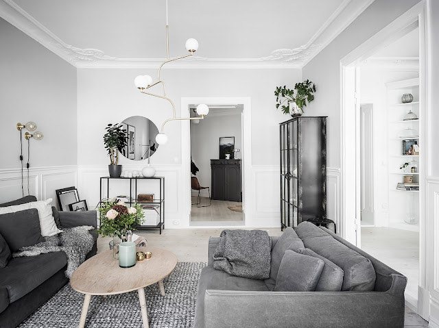 Harmaa sohva näyttää niin hyvältä näissä kuvissa että taidan laittaa harmaan sohvan harkintaan nykyisen valkoisen tilalle. Pastelliset ja vaaleammat harmaat tyynyt sekä lampaan talja ovat houkutteleva kombinaatio. Muutenkin tämä 112 m2 asunto on sisustettu aistikkaan elegantisti, harmaa ja musta vuorottelevat tasapainoisesti ja joukkoon on laitettu viherkasveja. Tykkään, todellakin.