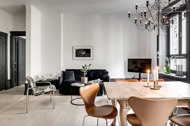 Ylellisesti rempattu kaksio, jossa erityisesti silmäni kiinnittyvät mustiin ikkunakehyksiin sekä oven karmeihin, ne näyttävät virkistävän erilaisilta. Kodin väritys mustine ja harmaine kalusteineen sopii kivasti keittiön toffeen värisiin nahkatuoleihin ja puupöytään. Moderni kattokruunu korostaa ruokailutilaa. Tyylikäs kokonaisuus.