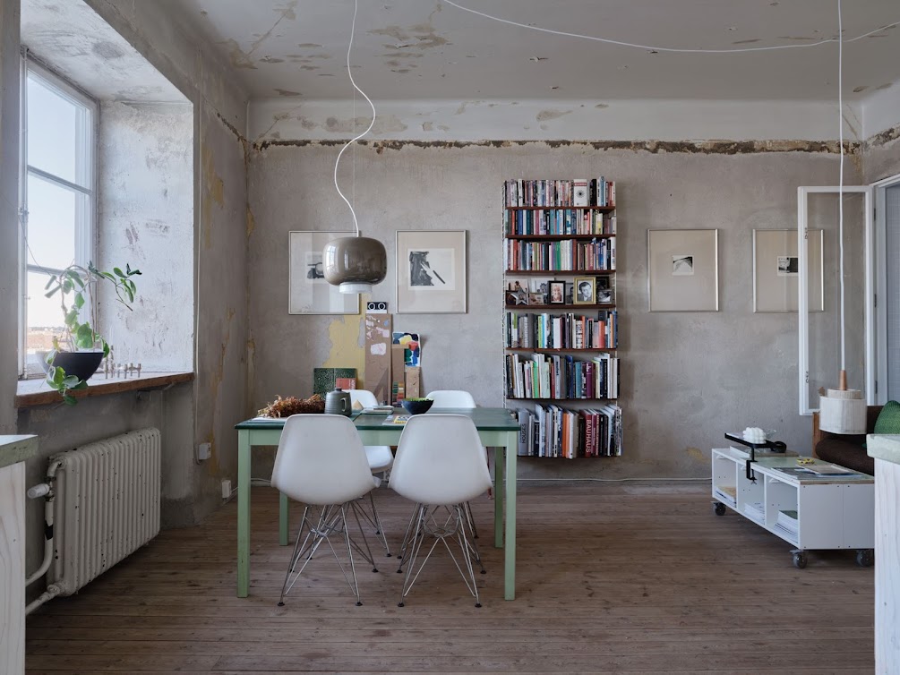 Vain 36 m2:n kokoinen asunto mutta kaikki elämiseen tarvittava löytyy tästä persoonallisesta kodista. 2,8 metrin huonekorkeus sekä kaksi leveää ikkunaa tuovat tilan tuntua. Keittiö on näppärästi eroteltu muusta tilasta maalaamalla lankkulattia valkoiseksi, ja vaneriset hyllyt, kaapit ja laatikot sekä betoniset tasot ovat hyvä ratkaisu. Kaakelit on korvattu lasilla, joka peittää raa'aksi jätetyt seinäpinnat. Makuusoppi on rakennettu paikalleen ja sen sivuilla ja päällä on vaneriset hyllyt ja kaapit. Sen alta löytyy jopa walk-in-closet -tyyppinen vaatteiden säilytystila. Vaneriset ratkaisut eri tiloissa ja avoin tilaratkaisu luovat loft-henkisen kodin. Kaikin puolin toimiva originelli koti.