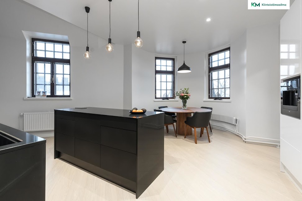 A marvellous two-storey penthouse is situated in Eira district of Helsinki. Boulevards and stone walls around houses and yards are typical to Eira. This particular house is from 1911 which gives its own feeling and charateristics to the home. The sea is nearby and view from the home is verdant and green. The home has gone through a renovation from floors to ceilings. The kitchen has been made with very restrained and minimalistic way with black cupboards, white storage cabinets and the raw brick wall is the icing on the cake. The room height in the living room brings light and airiness. Admire also the bathroom's color combo with mustard brown tiles. In the second floor there are living areas and sleeping spaces.